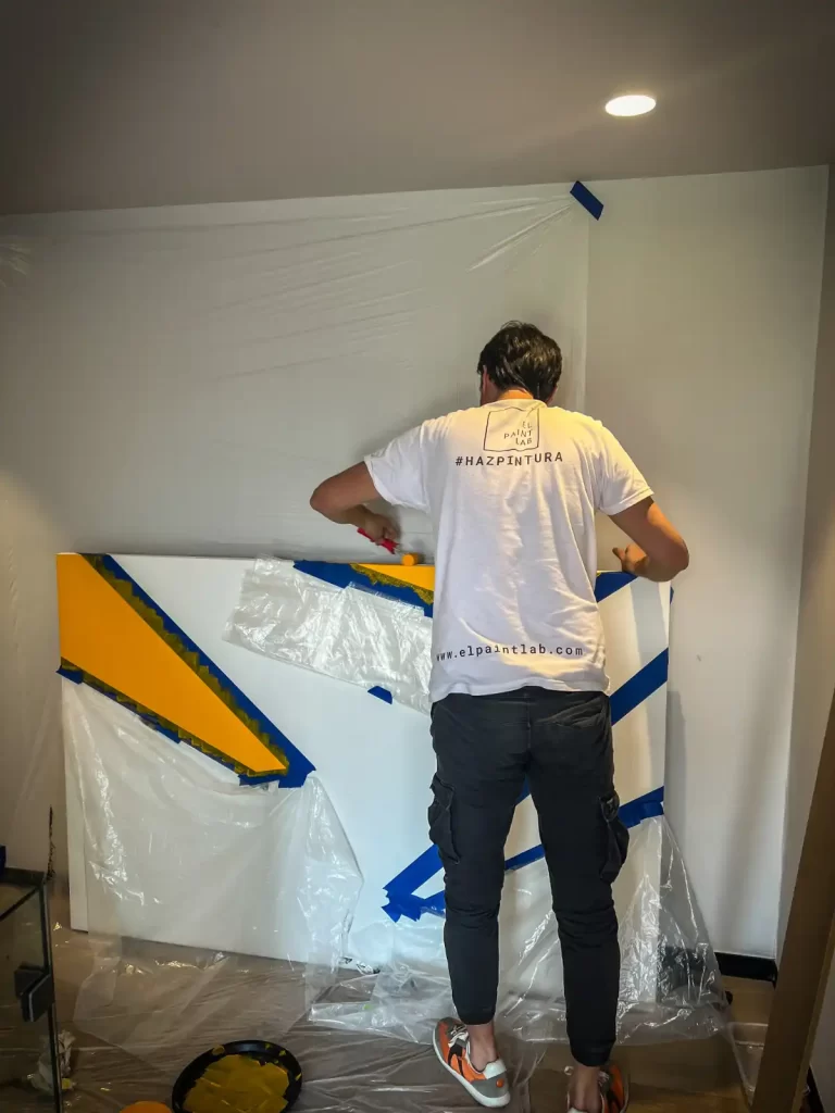Sebastián Barrandeguy desarrolla composiciones geométricas de ilusión óptica con cinta y rodillo, utilizando diluyente de El Paint Lab para mejorar la fluidez y precisión de la pintura.