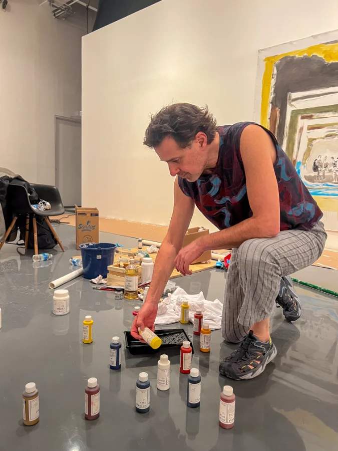 Milton Manetas trabajando con las dispersiones de pigmento directo sobre muro, creando un mural en constante transformación que puede modificarse periódicamente con agua y jabón.