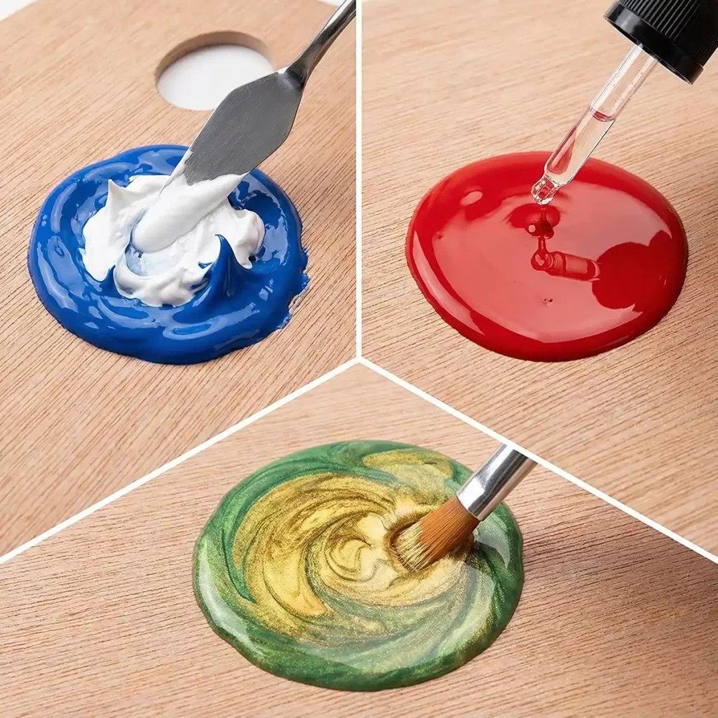 Añade a tu medio base los pigmentos líquidos gota a gota hasta definir el color de tu pintura.